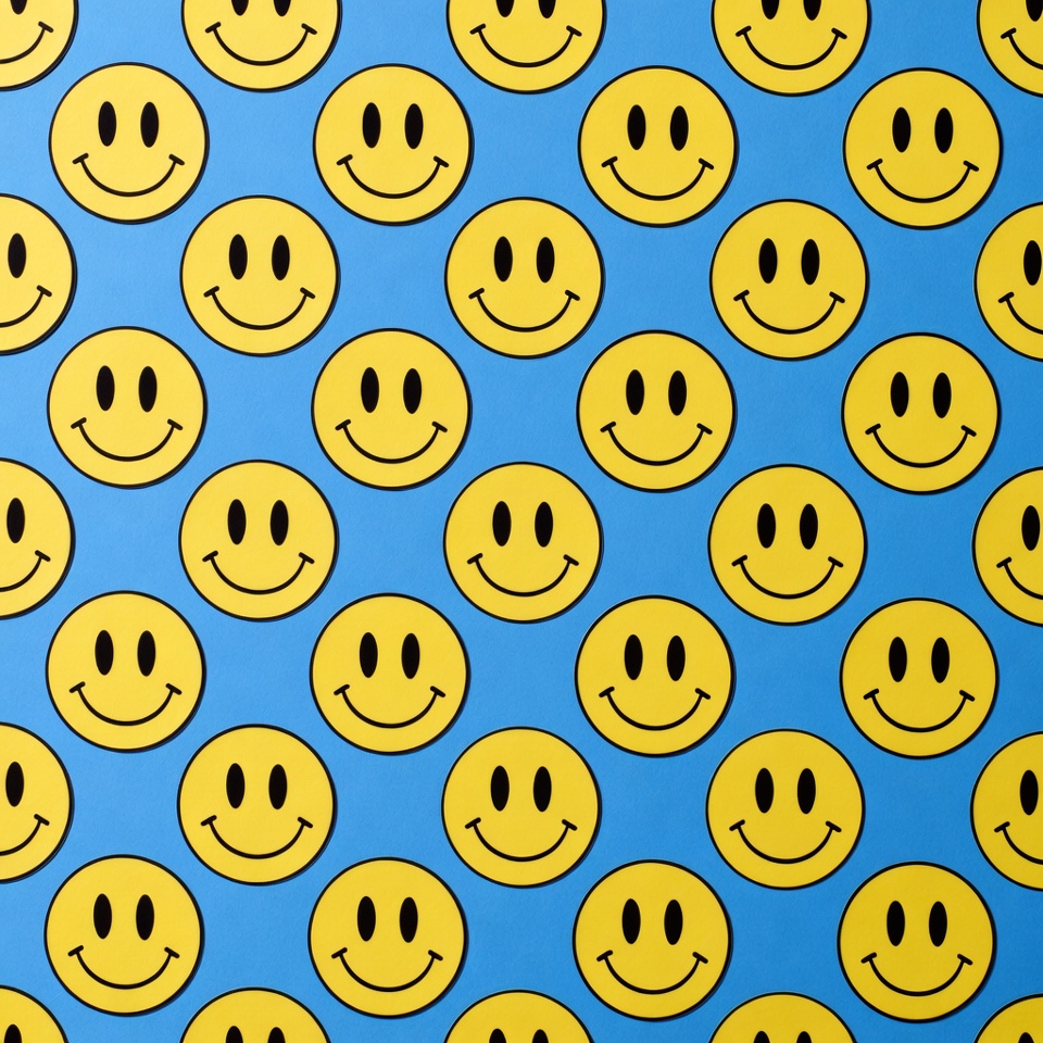 A seamless pattern of numerous yellow smiley faces arranged in a grid on a solid blue background. Each smiley face features black eyes and a curved mouth expressing happiness. The design is simple, bold, and repetitive.