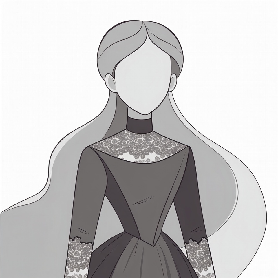 A grayscale illustration depicts a woman with long flowing hair wearing a high-neck Victorian dress adorned with intricate lace patterns on the collar and cuffs. She faces forward on an isolated white background. Her facial features are blank, stylized in a simple cartoon style.