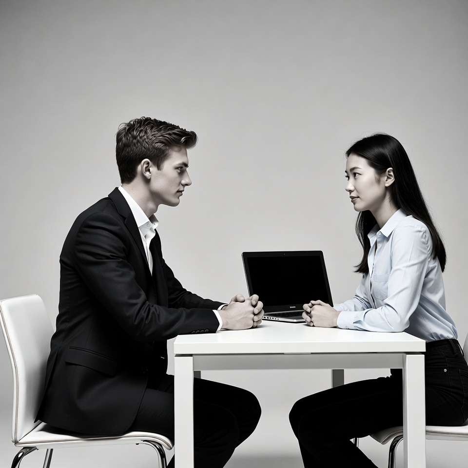 A young White man in a black suit sits across from a young Asian woman in a blue blouse at a white table during a job interview. A laptop is open on the table between them. Both are seated on white chairs against a gray background, facing each other attentively.