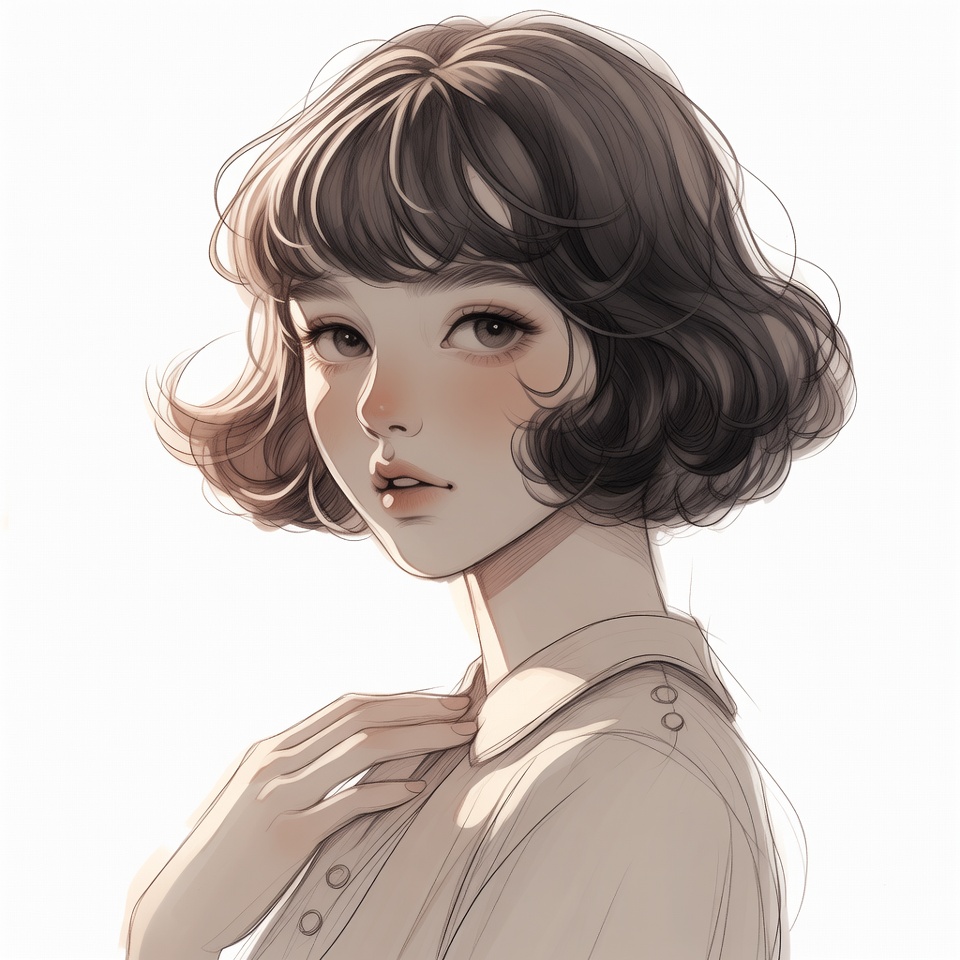 Asian, artwork, bob haircut, brown hair, buttons, collared blouse, cute, digital art, expressive eyes, face closeup, female, hand gesture, illustration, isolated background, large eyes, lips, neck, portrait, soft shading, stylized, wavy hair, white shirt, woman, young, anime girl