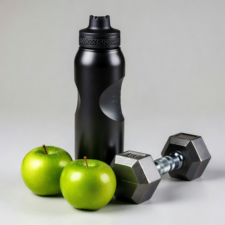 Green Apples, Black Water Bottle, Dumbbells