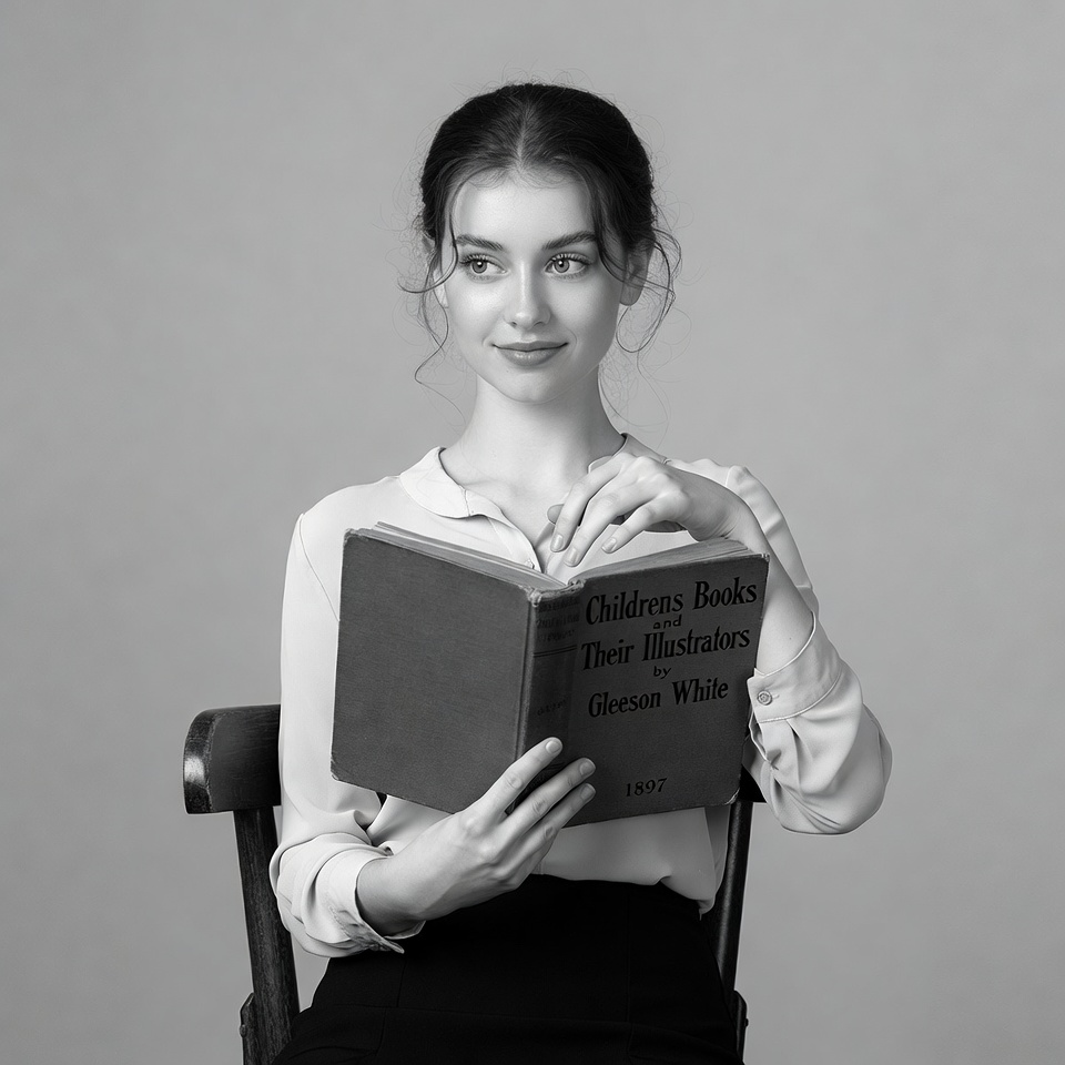 A young woman with dark hair in a bun sits on a wooden chair holding an open vintage book titled 'Children's Books and Their Illustrators' by Gleason White, 1897. She wears a white collared blouse and black skirt, gazing slightly to the side with a subtle smile. The image is in black and white with a plain background.