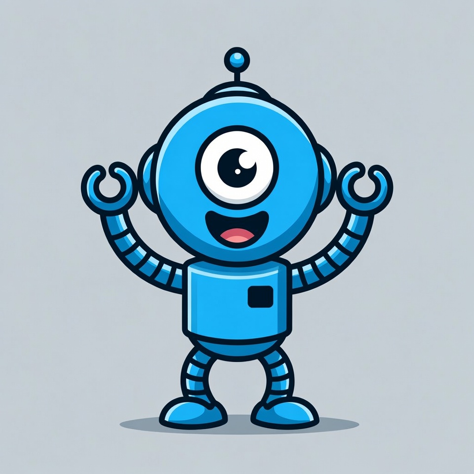 A cheerful blue cartoon robot with a single large eye and wide smile stands on a light gray background. It has metallic arms raised in excitement and segmented legs. The illustration features a simple, friendly design with blue accents.