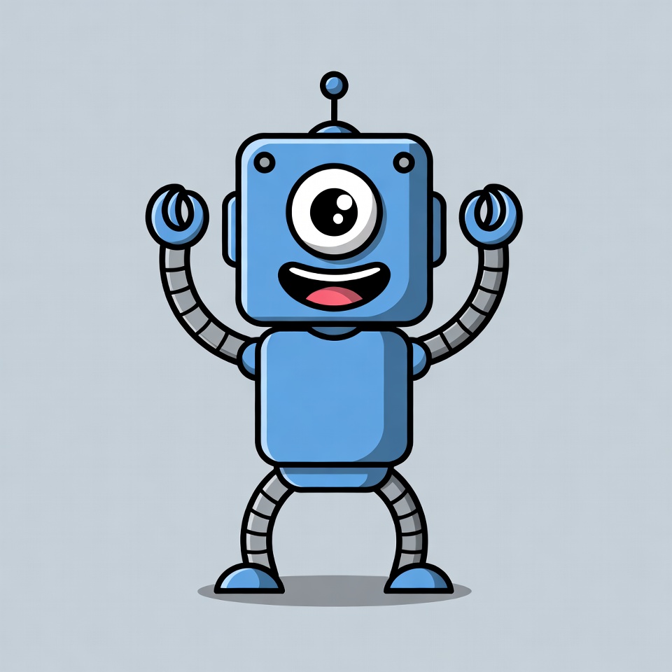 A cute blue robot with a large single eye and wide smile stands with arms raised excitedly. It has a boxy body, antenna on top, and segmented metal arms and legs. The illustration is on a light gray isolated background.