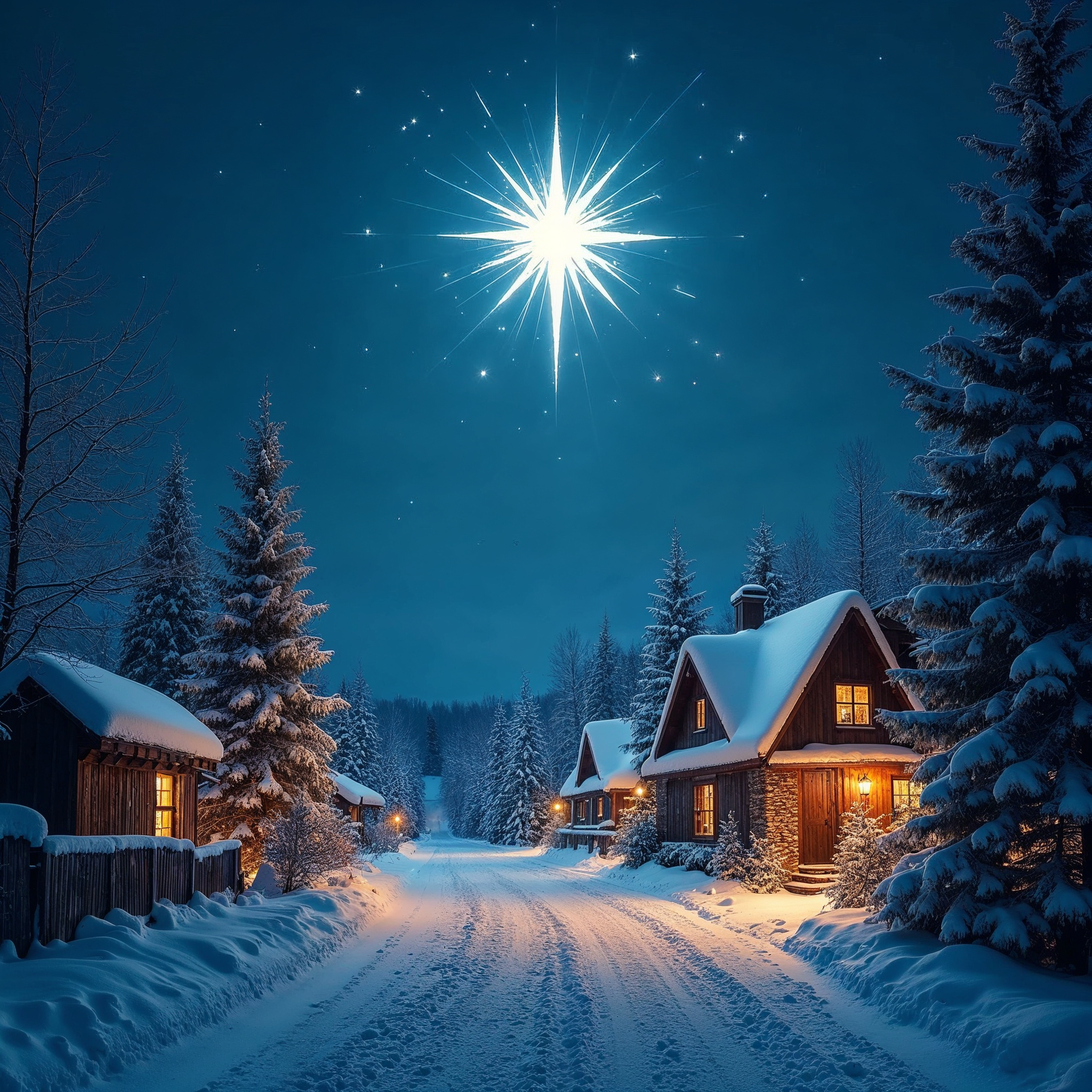 A snowy path winds through a cluster of wooden cabins covered in snow, surrounded by evergreen pine trees. A bright shining star glows prominently in the dark blue night sky above the village. Warm lights illuminate the windows of the cozy homes.