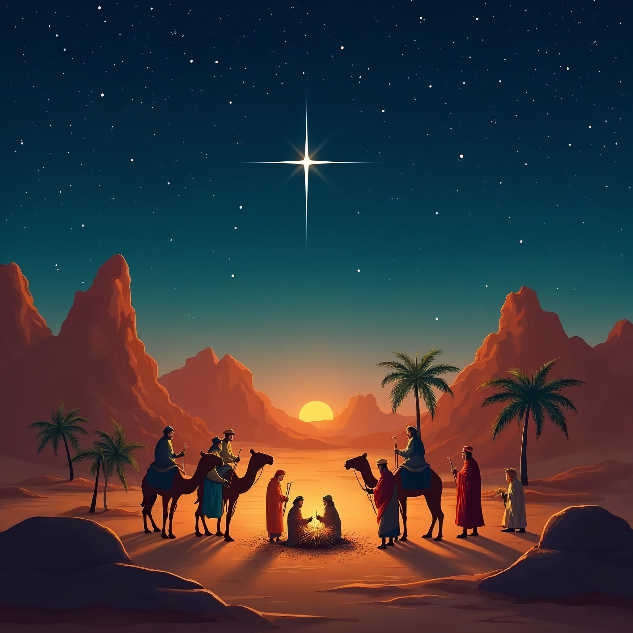 Bethlehem, Christmas, Joseph, Mary, Middle Eastern, baby Jesus, camels, clipart style, desert landscape, holy family, illustration, magi, male, manger, mountains, night sky, palm trees, people, religious art, star of Bethlehem, sunset, three wise men, wise men, nativity scene