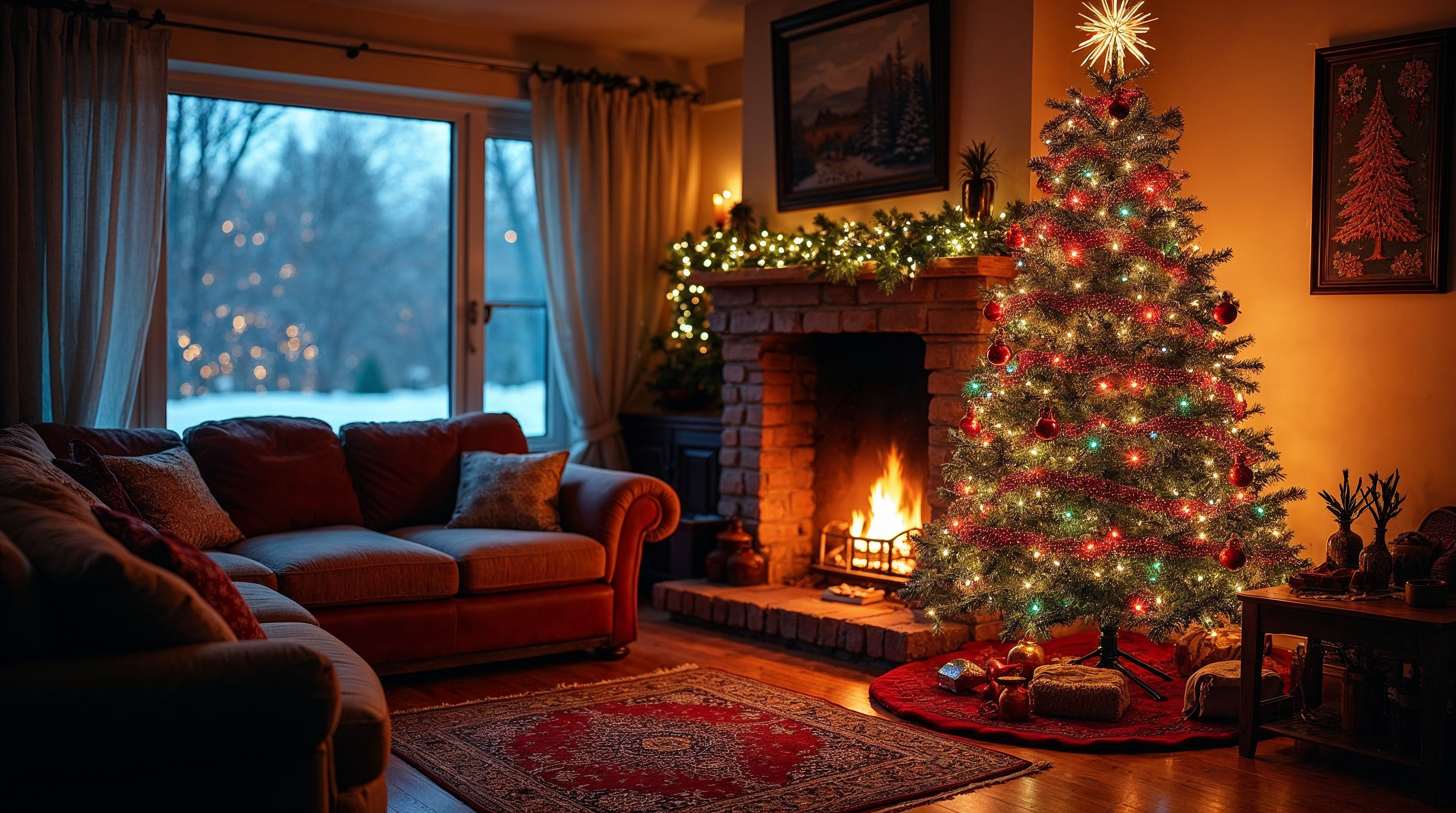A warmly lit living room features a decorated Christmas tree adorned with lights and a star topper next to a brick fireplace with a crackling fire. Beige sofas sit on a red rug, surrounded by garlands, candles, and wrapped gifts under the tree. Large windows reveal a snowy winter landscape outside at dusk.