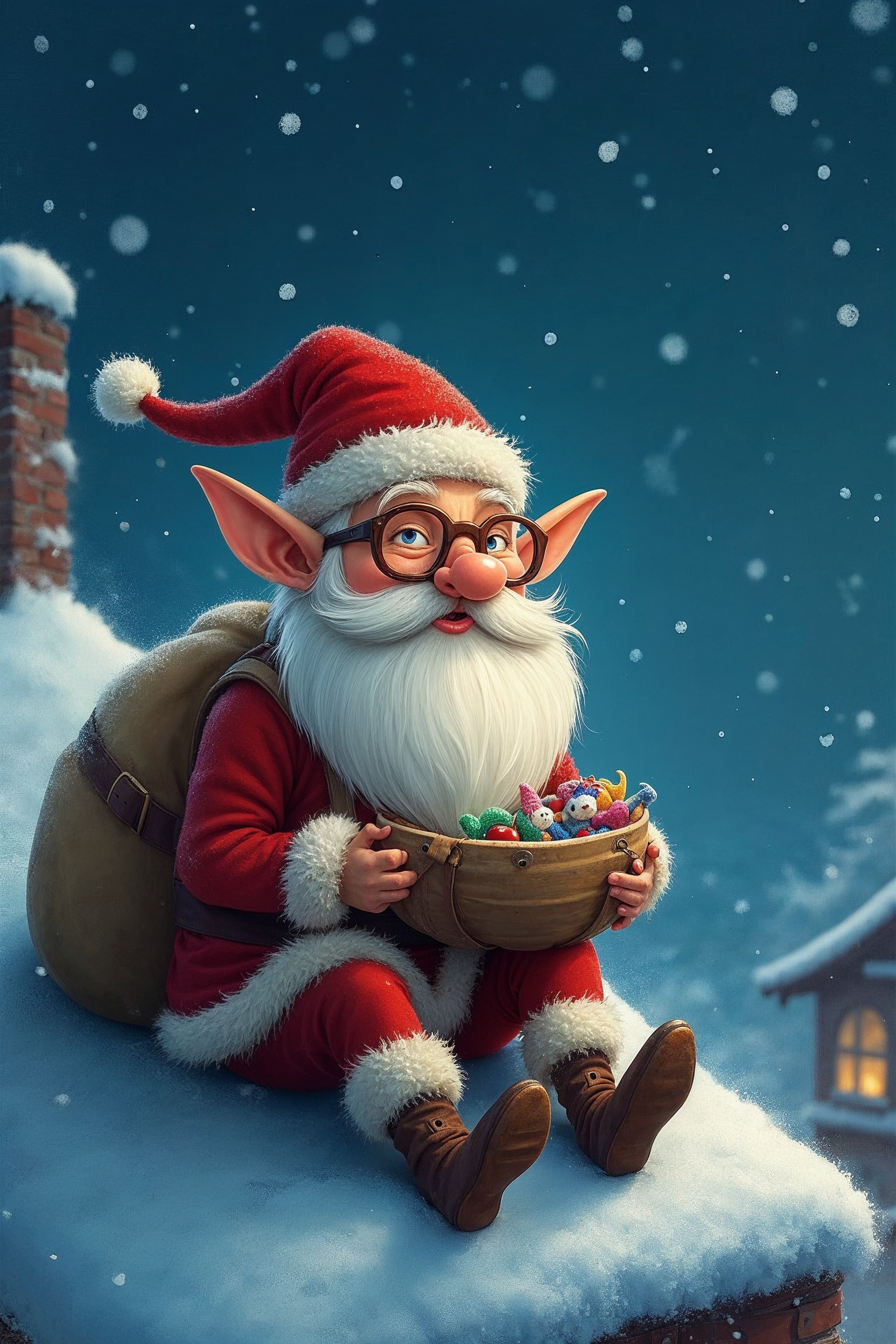 A cute elf version of Santa Claus with a red hat, white beard, and glasses sits on a snowy rooftop at night. He holds a wooden basket filled with colorful candies and carries a large sack on his back. Snowflakes fall around the house with a lit window below.