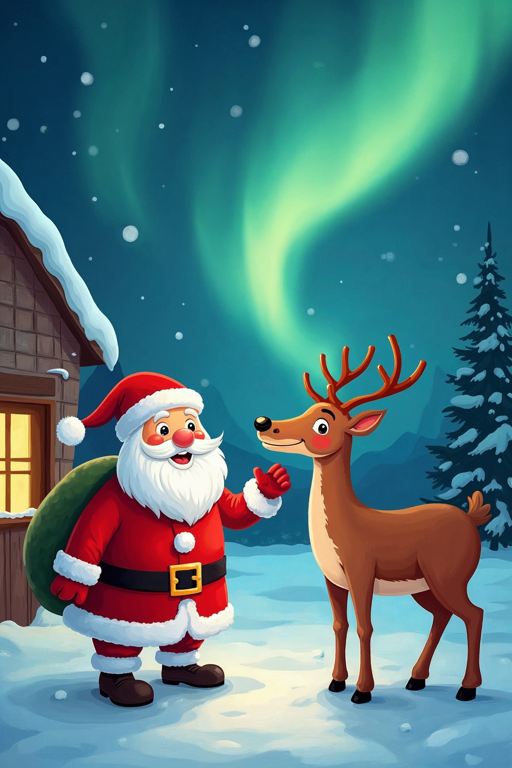 A cheerful cartoon Santa Claus in a red suit and white-trimmed hat stands smiling next to a cute reindeer with antlers. They are positioned in a snowy landscape with a cabin topped in snow, evergreen trees, and a vibrant green aurora borealis lighting the night sky. Santa holds a sack over his shoulder and gives a thumbs-up gesture.