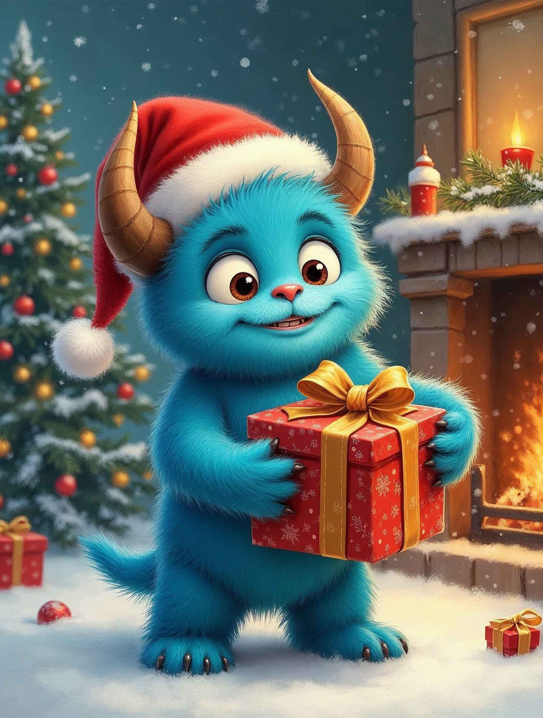 Christmas gift, Christmas tree, Santa hat, candles, clipart, cute monster, festive, fireplace, furry creature, gift holding, holiday, horns, illustration, isolated background, mantel, ornaments, red gift box, snow, warm light, blue monster
