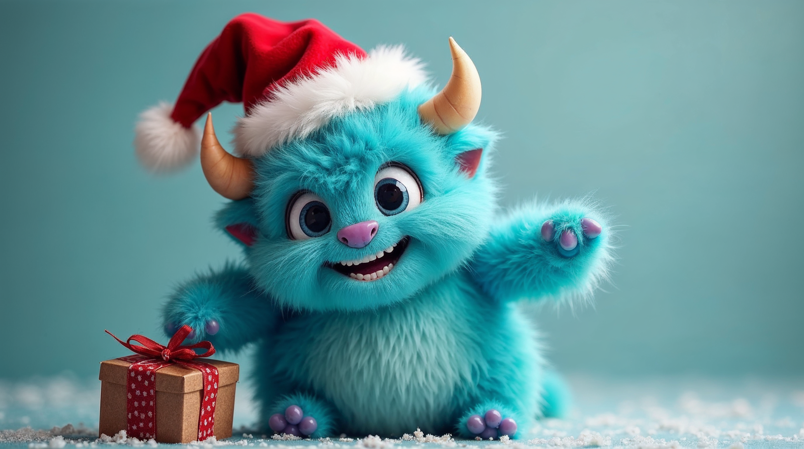 A fluffy blue monster with horns and big eyes wears a red Santa hat and holds a brown gift box with a red ribbon. It sits on a snowy surface against a light blue background, waving one paw happily. The creature has a wide smiling mouth and fuzzy texture.