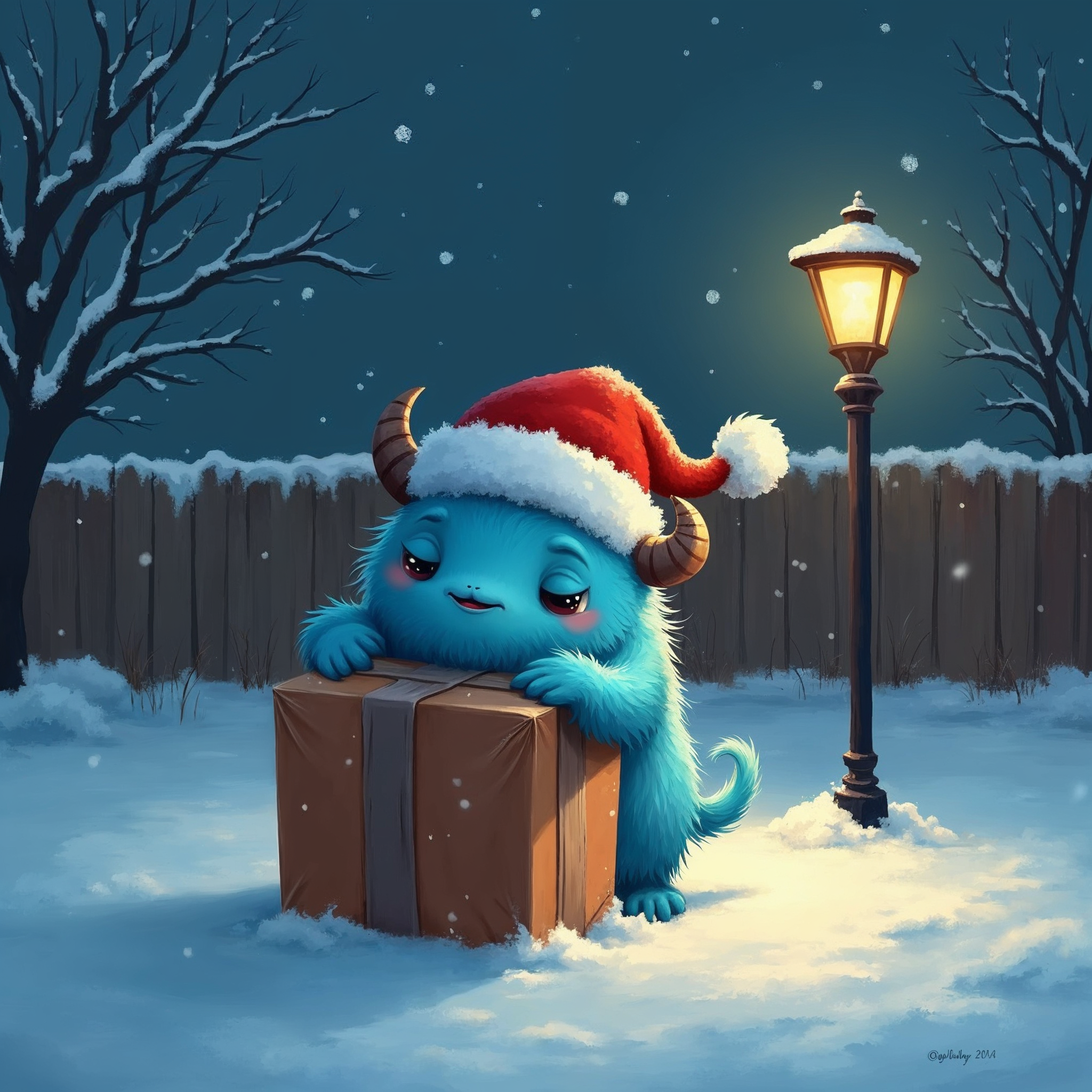 A cute blue furry monster with horns wears a red Santa hat and leans on a large brown gift box wrapped with a ribbon. It stands in a snowy yard at night, illuminated by a glowing street lamp, with bare trees and a wooden fence in the background. Snowflakes gently fall around the scene.