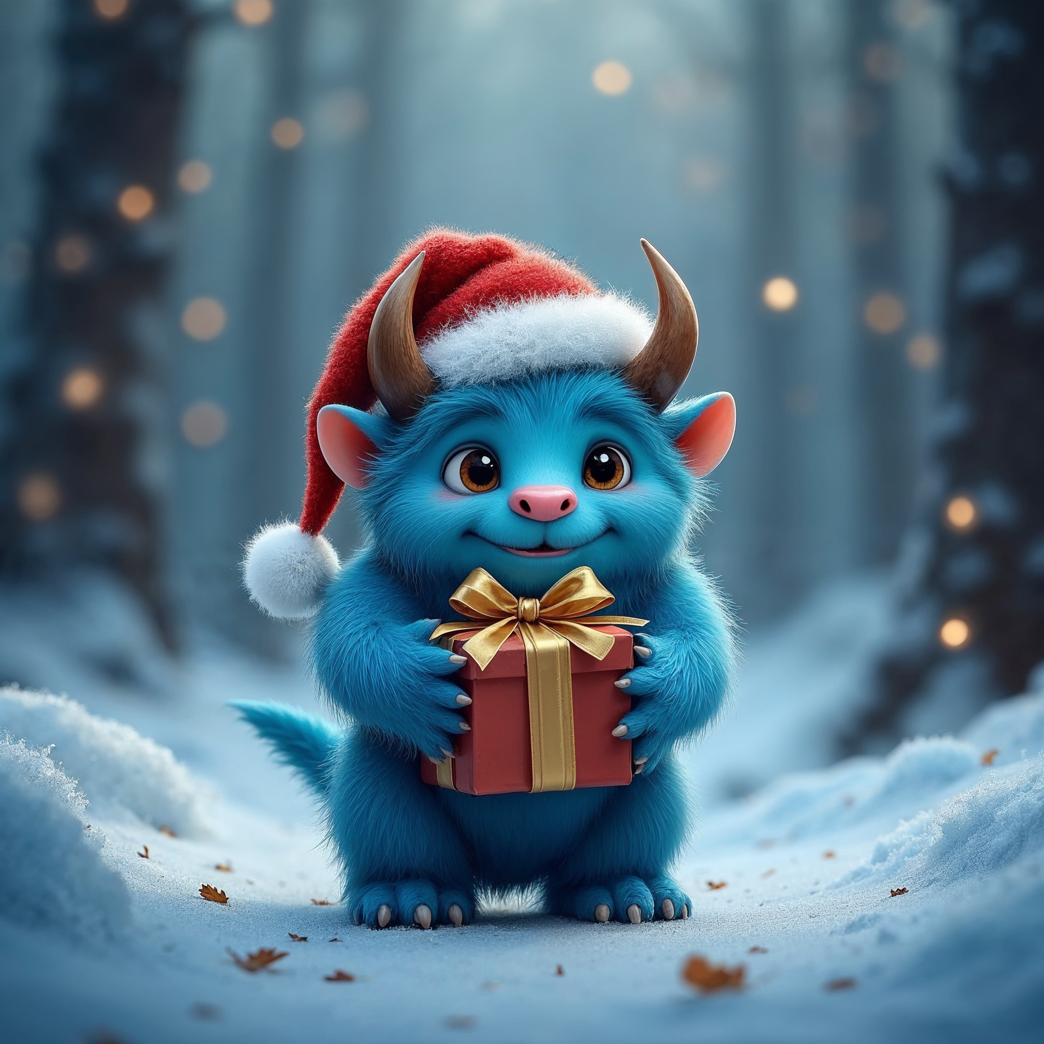 Christmas gift, Santa elf, Santa hat, big eyes, blue fur, bokeh lights, cute animal, digital art, fallen leaves, fantasy art, furry monster, gift holding, glowing lights, gold ribbon, holiday creature, horns, illustration, magical forest, red box, red hat, snow path, snowy forest, whimsical monster, white pom pom, winter scene, blue creature