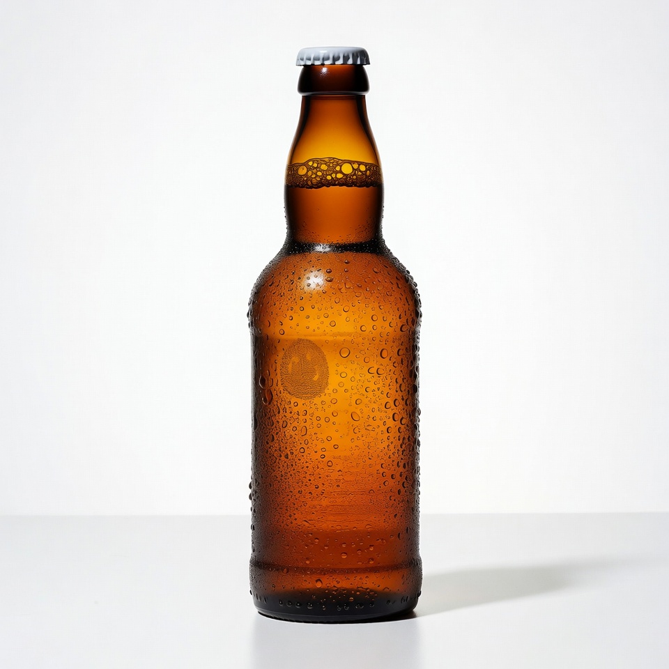 alcohol, beer, beverage, bottle cap, brown bottle, bubbles, cold beer, condensation, drink, foam, glass bottle, isolated, product shot, refreshment, silver cap, water droplets, white background, beer bottle