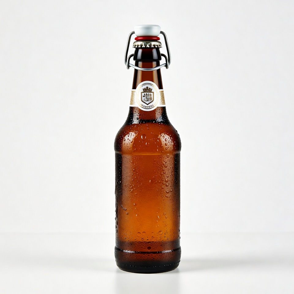 alcohol, beer label, beverage, brown bottle, chilled beer, cold drink, condensation, emblem, flip top cap, glass bottle, isolated background, lager, swing top, water droplets, white shield, beer bottle