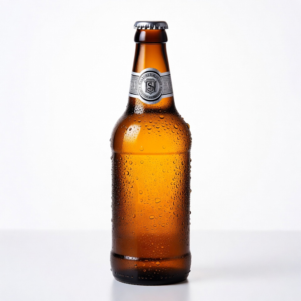 alcohol, beer, beer label, beverage, brown glass, chilled drink, cold beer, condensation, isolated background, product shot, silver cap, transparent glass, water droplets, white background, beer bottle