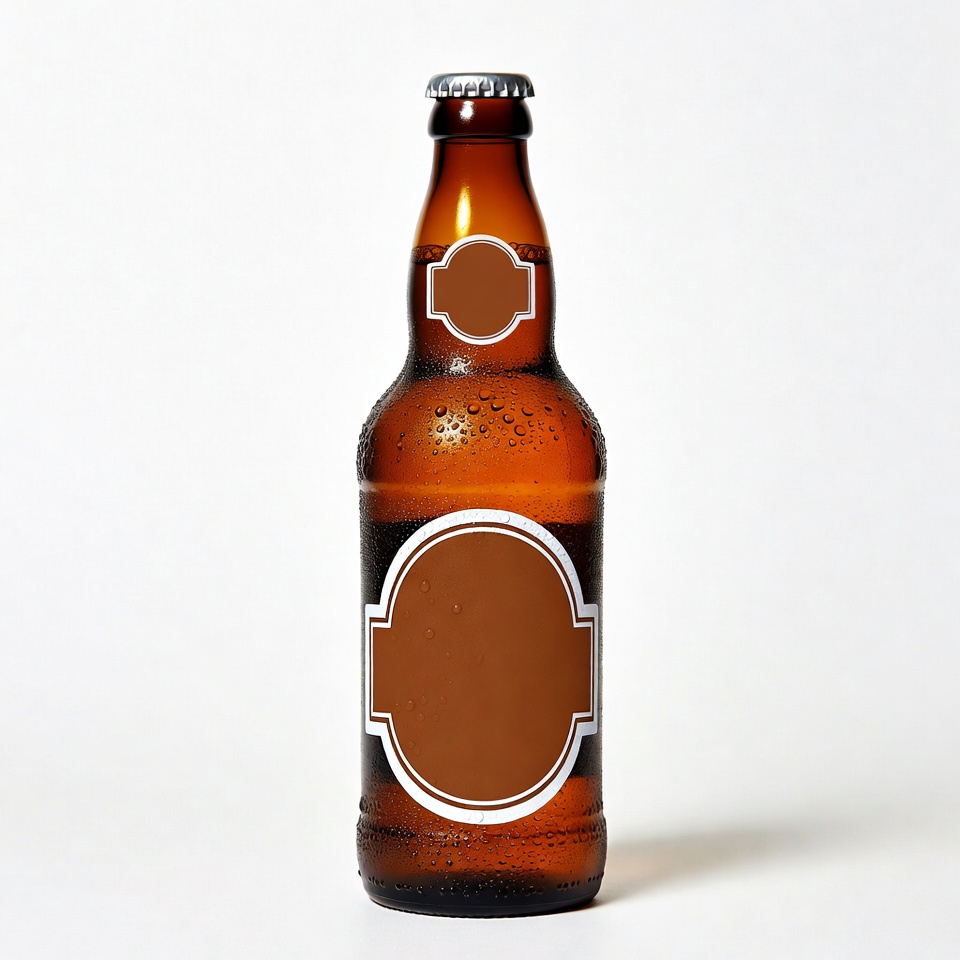 A brown glass beer bottle with a silver cap sits on a white background. It features a large blank brown label with white borders on the front and a smaller blank label on the neck. Condensation droplets cover the bottle's surface.