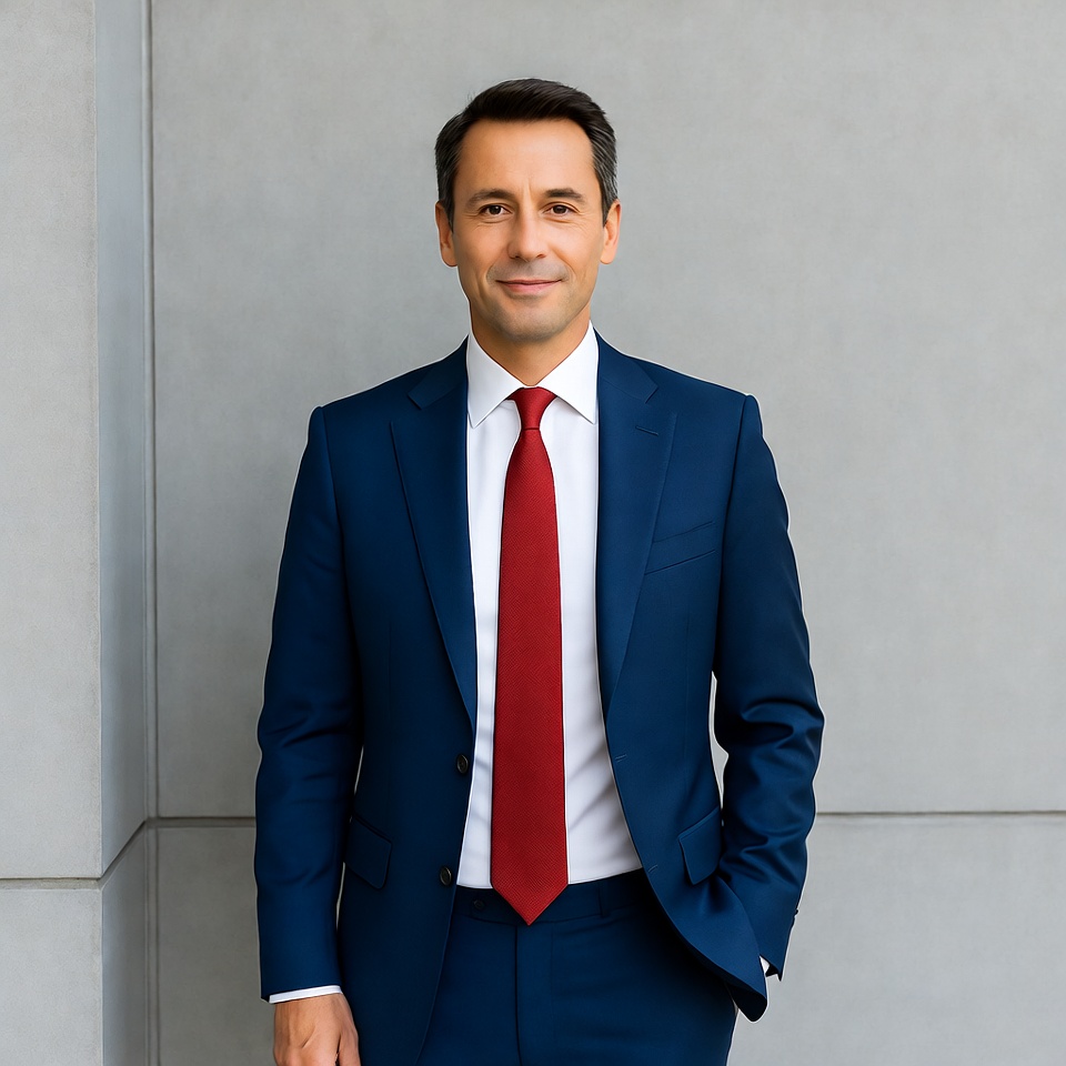 A middle-aged man with short dark hair stands confidently against a gray wall. He wears a navy blue suit, white dress shirt, and red tie, with one hand in his pocket. He smiles directly at the camera.