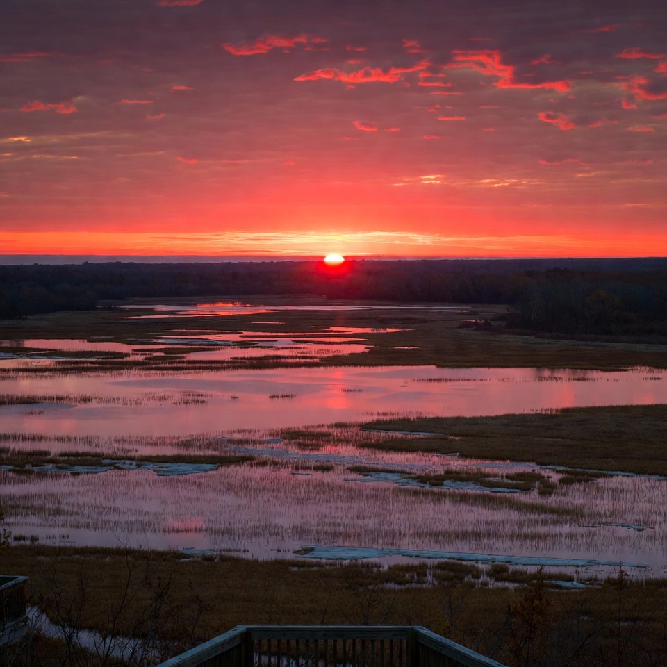 aerial view, boardwalk, clouds, dawn, dusk, fall colors, golden grass, horizon, landscape, marsh, nature, orange sky, outdoor, red clouds, reeds, reflection, scenery, sky, sunrise, water, wetlands, wooden walkway, sunset