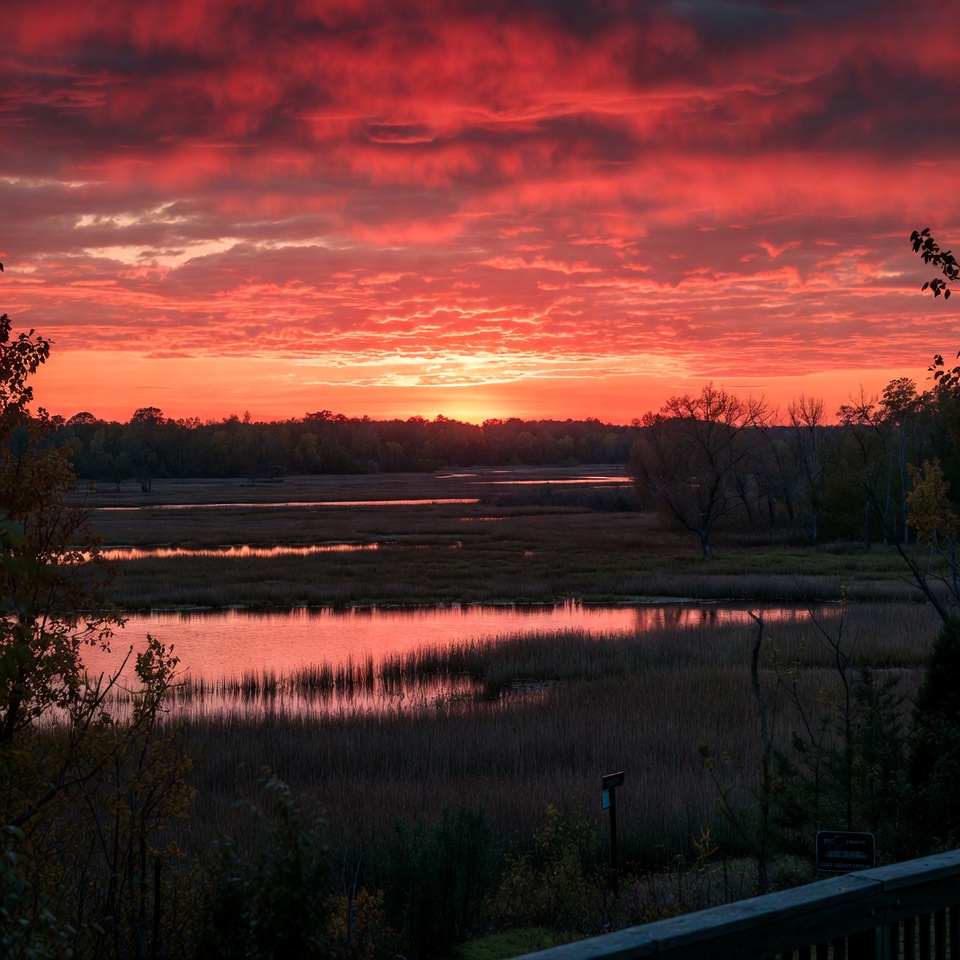 A stunning sunset sky filled with red, orange, and pink clouds reflects over a calm marsh with shallow waters and tall reeds. Bare autumn trees frame the foreground, and a wooden railing is visible in the lower right. The sun dips low on the horizon, casting warm hues across the landscape.