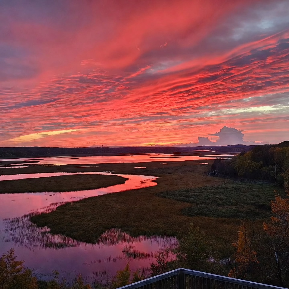 aerial view, autumn trees, boardwalk, clouds, dusk, fall foliage, grass, horizon, landscape, marsh, natural beauty, nature, orange sky, outdoor, peaceful landscape, pink clouds, red sky, reflection, river, scenery, sky, vibrant colors, water, wetlands, sunset