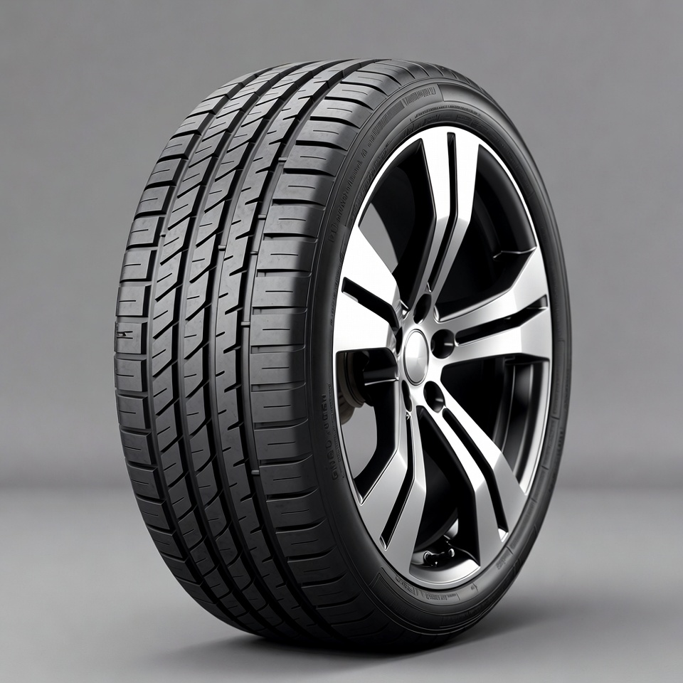 A new black car tire with tread pattern is mounted on a stylish silver and black alloy wheel. The tire features white lettering on the sidewall and is centered against a plain gray background. The wheel has a modern multi-spoke design with a central cap.