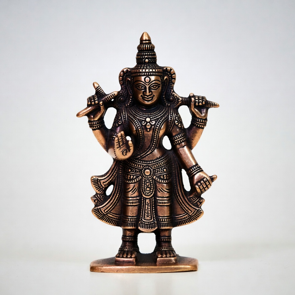Hindu god, Hinduism, Indian deity, Kartikeya, Skanda, South Indian, Tamil god, brass statue, crown, deity statue, figurine, four arms, isolated background, jewelry, religious idol, rooster emblem, sculpture, skirt, spears, worship idol, Murugan