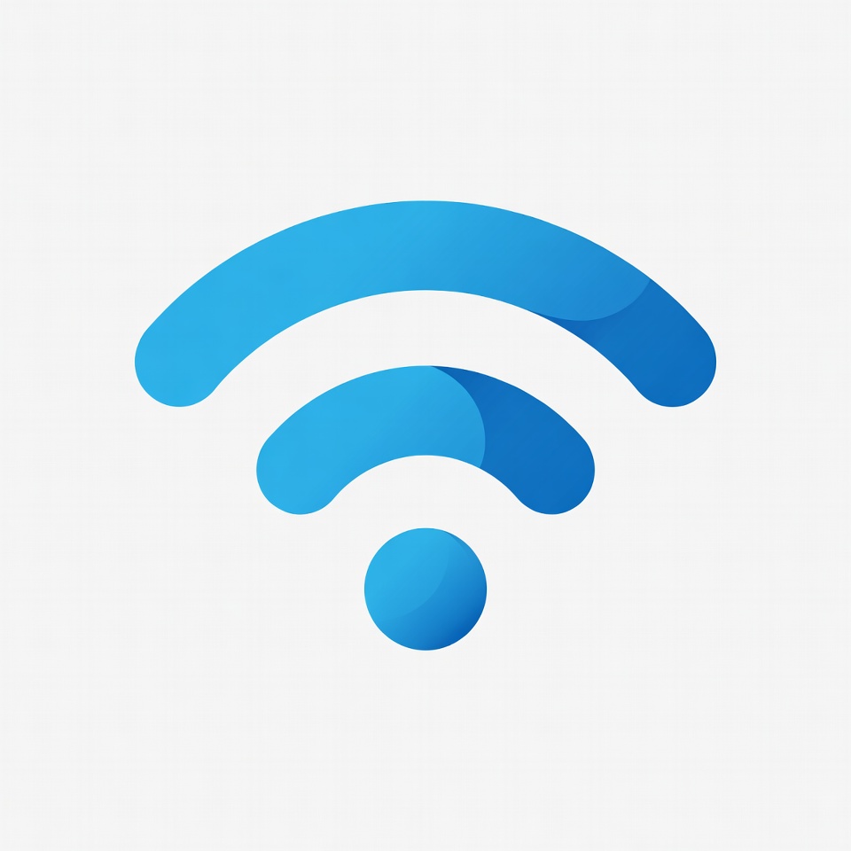 A vibrant blue WiFi signal icon features curved arcs emanating from a central dot. The design uses smooth gradients on a white isolated background. It represents wireless internet connectivity.