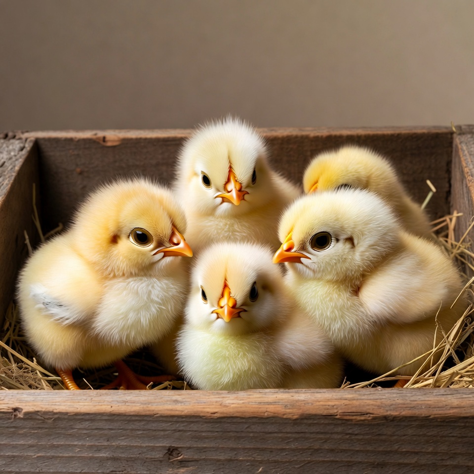 Five adorable yellow chicks with orange beaks huddle together in a rustic wooden crate filled with straw. Their fluffy feathers and bright eyes are prominently featured against a neutral background. The chicks are arranged closely, facing forward.