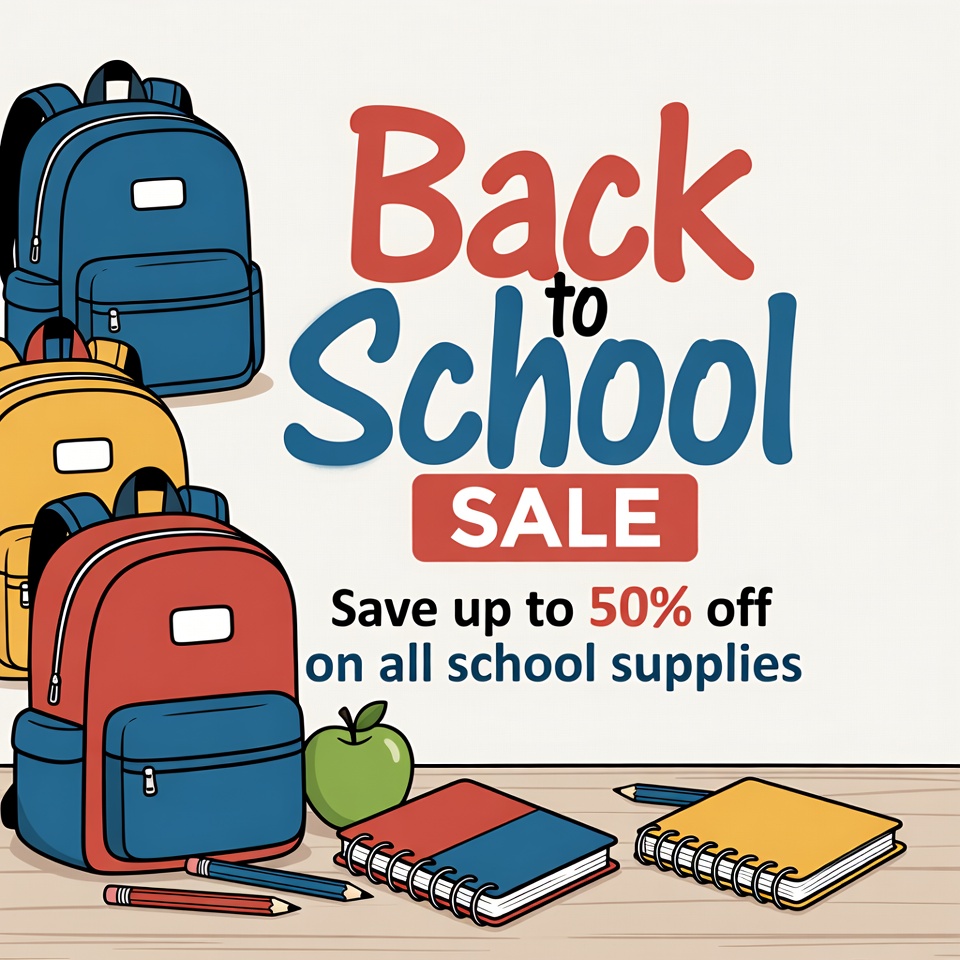 Colorful illustration features multiple backpacks in blue, yellow, and red arranged together. Bold text reads 'Back to School Sale' with 'Save up to 50% off on all school supplies'. A green apple, notebooks, and pencils sit on a surface in front.