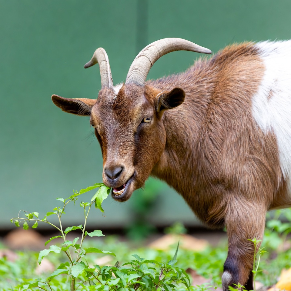 animal, brown goat, chewing plants, curved horns, eating leaves, farm animal, goat eating, green leaves, green wall, isolated background, livestock, mammal, outdoors, vegetation, white goat, goat