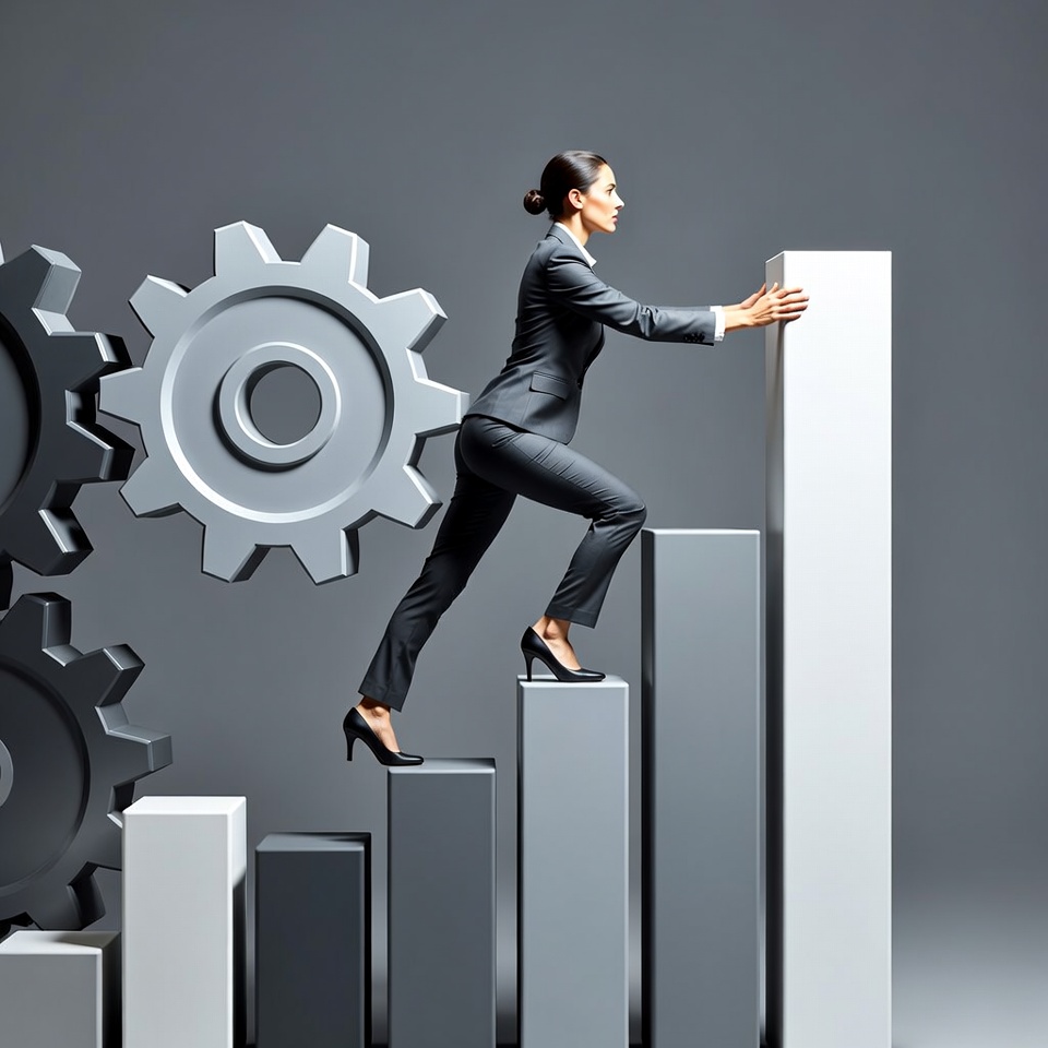 A woman in a gray business suit climbs a series of ascending white and gray bar graph columns. Large metallic gray gears float in the background. She extends her hand toward the top of the tallest column while wearing high heels.