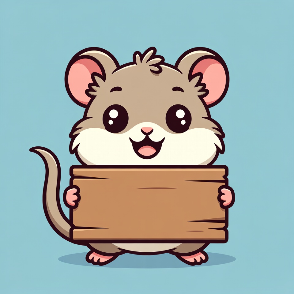 A kawaii cartoon hamster with big sparkling eyes and a happy smile holds a large blank wooden sign. It stands on a light blue background with its tail curled and tiny paws gripping the sign. The illustration features soft brown fur and simple line art style.