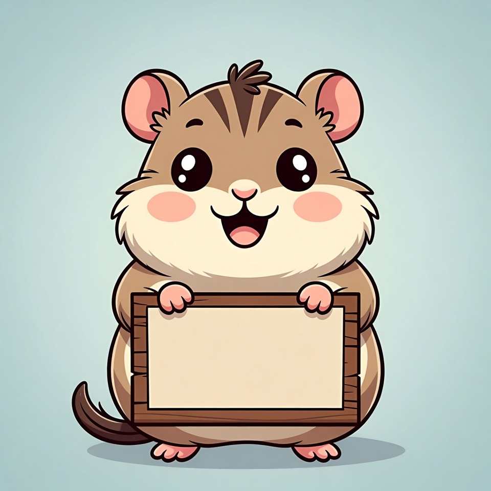 A cartoon hamster with brown fur and big sparkling eyes holds a wooden sign with a blank beige surface. It stands on a light blue background with a cheerful smile and fluffy cheeks. The illustration features a striped pattern on the hamster's back and tiny paws gripping the sign.
