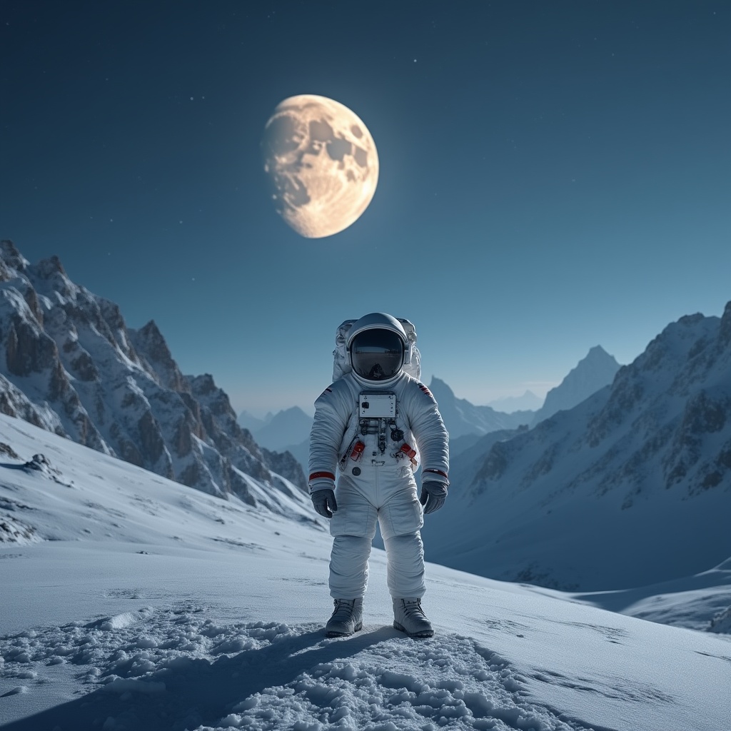 A male astronaut in a white spacesuit stands on a snowy mountain ridge under a large full moon. Snow-covered peaks surround him in the dark night sky. He faces forward with his helmet visor reflecting the lunar glow.