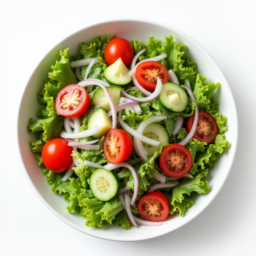 A vibrant garden salad fills a white bowl, featuring crisp green lettuce leaves topped with sliced cucumbers, red cherry tomatoes, and thin red onion rings. The ingredients are arranged neatly from a top-down view. The salad looks fresh and ready to eat on a plain background.