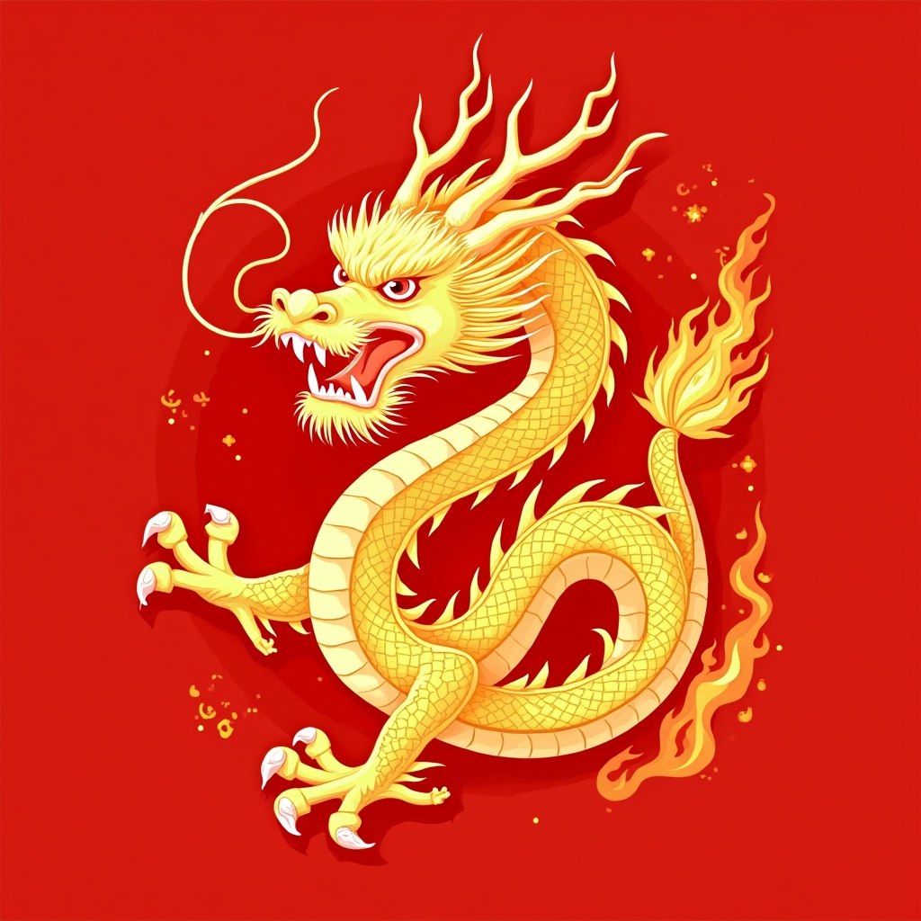 Asian dragon, New Year dragon, claws, clipart, dragon illustration, dynamic pose, fierce dragon, fire effects, flames, golden dragon, isolated background, mythical creature, red background, scales, snarling dragon, stars, vector art, whiskers, yellow dragon, Chinese dragon