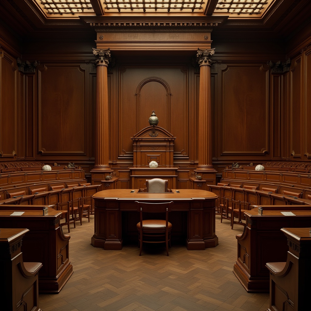 arched recess, columns, court interior, dark wood, decorative emblem, empty courtroom, grand hall, high-backed chair, judge bench, judge desk, judicial chamber, law court, legal setting, ornate architecture, parquet floor, pews, skylight ceiling, wooden benches, wooden interior, courtroom