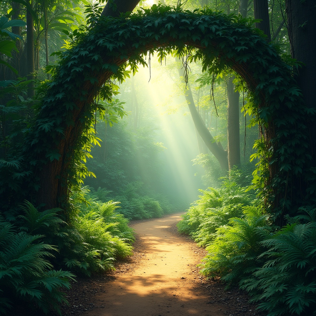 A large stone archway overgrown with lush green ivy stands in a dense tropical forest. Sunlight beams filter through the canopy, illuminating a winding dirt path that leads through the arch into the misty woods. Ferns and vines surround the scene, creating a magical, enchanted atmosphere.
