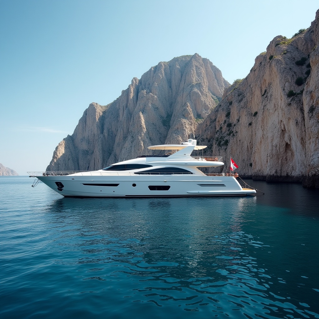 A sleek white luxury yacht with a red flag is anchored in calm turquoise waters. Towering rocky cliffs rise dramatically from the sea in the background under a clear blue sky. The yacht features multiple decks and modern design elements.