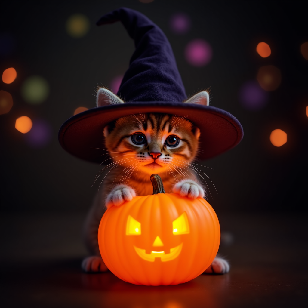 A cute tabby kitten with orange and brown stripes wears a large black witch hat and holds a glowing jack-o-lantern pumpkin. The kitten sits on a dark background with colorful bokeh lights and Halloween sparkles. Its big blue eyes gaze forward playfully.