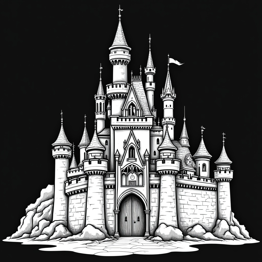 Cinderella castle, Disney castle, arched windows, black and white, clipart, double doors, fairy tale castle, fantasy castle, flag, illustration, ink drawing, isolated background, line art, magic kingdom, medieval castle, rocky base, spires, towers, castle