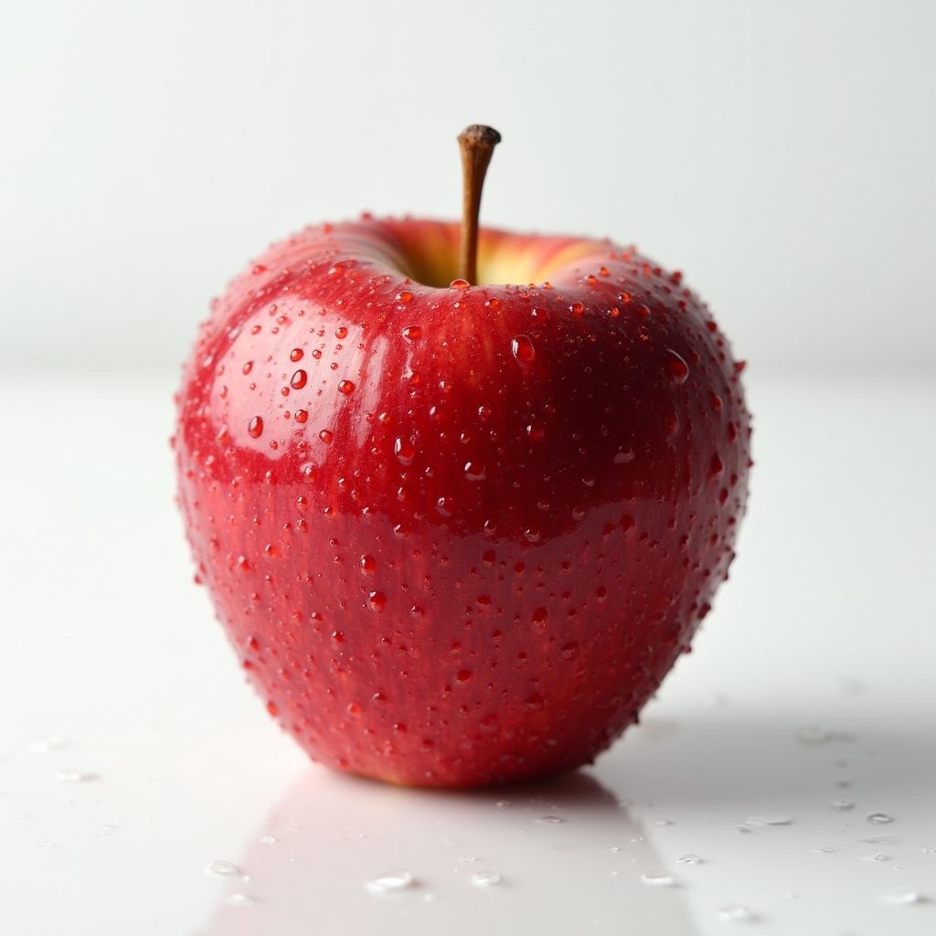 A vibrant red apple with a brown stem sits on a white surface. Water droplets glisten on its smooth skin, highlighting its fresh texture. The apple's reflection is visible on the glossy surface below.