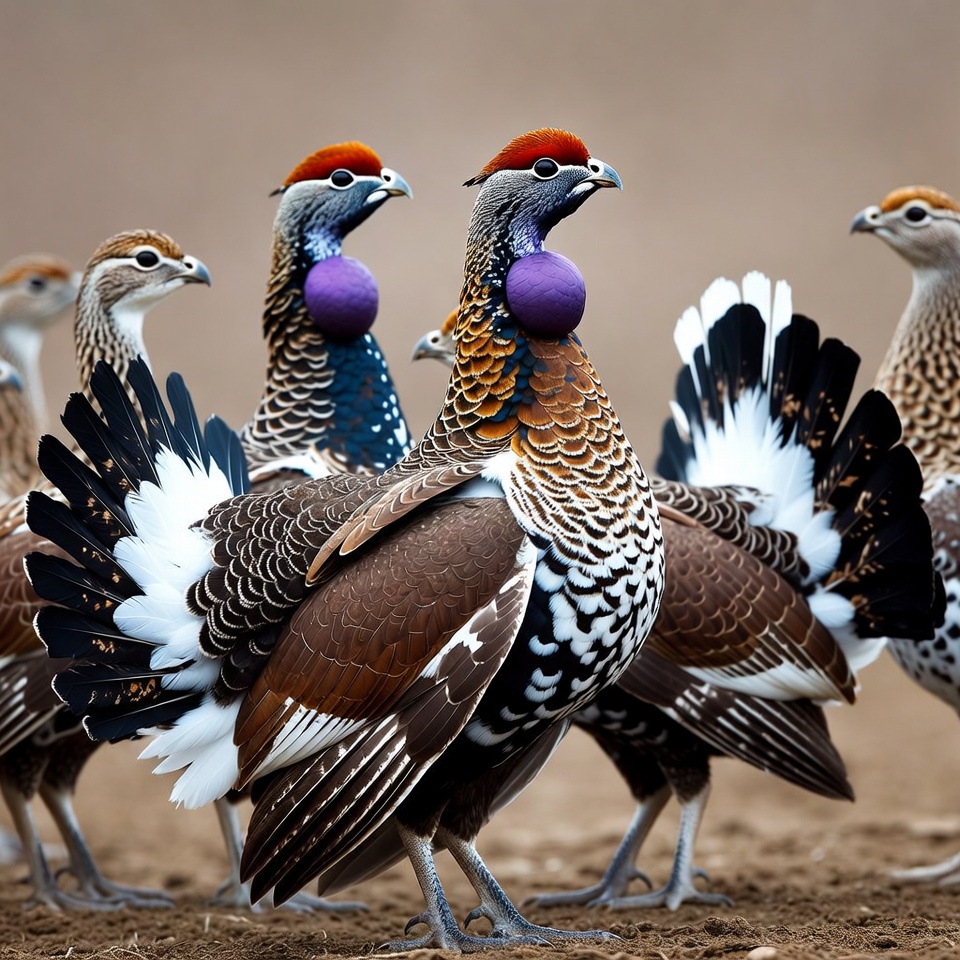 Several Lady Amherst's quail stand together on a sandy ground with a blurred background. The birds display vibrant plumage in shades of blue, purple, orange, and white, with prominent red crests and purple throat sacs. Their intricate feather patterns and tail feathers are prominently visible.