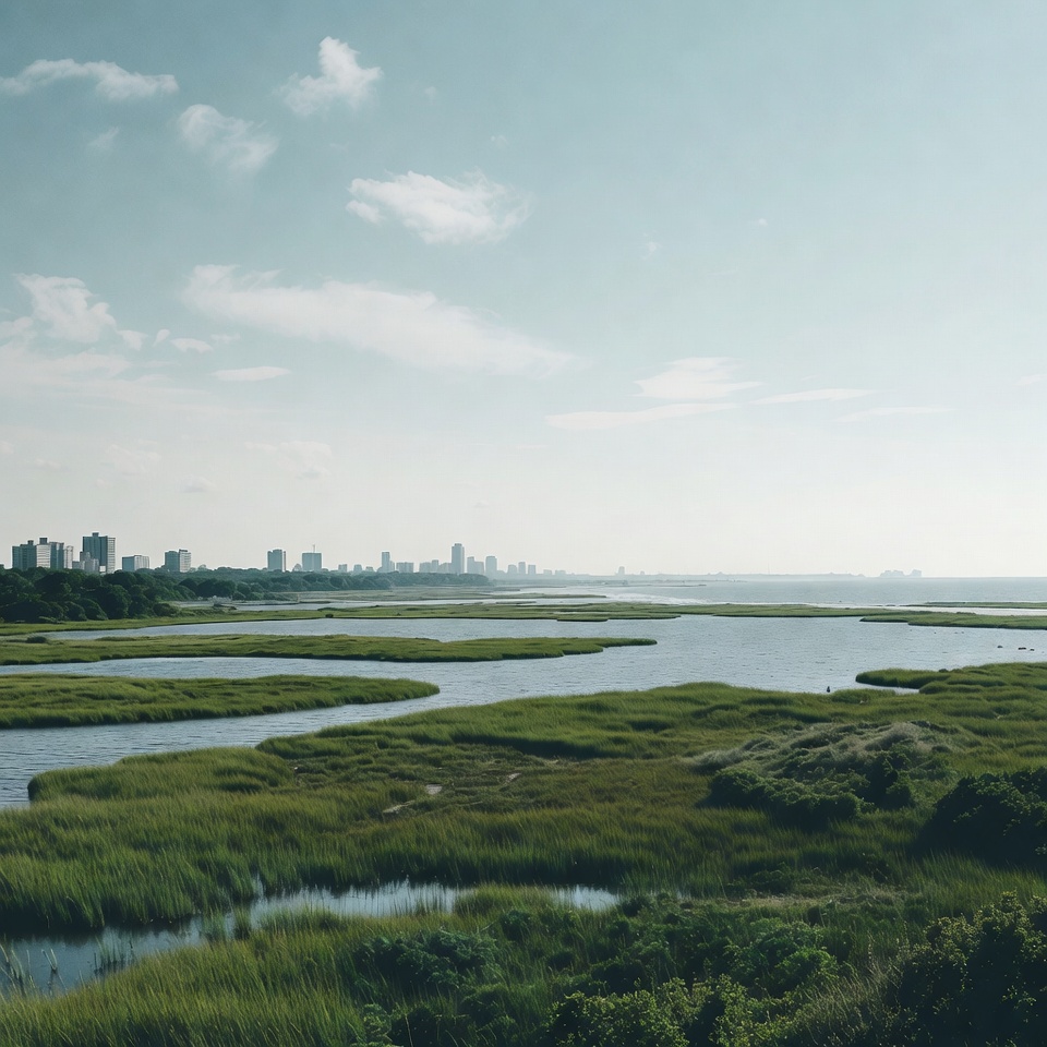 Vast green marshlands with winding waterways stretch towards a hazy city skyline of tall buildings. Scattered bushes and grasses fill the foreground under a partly cloudy sky. The serene landscape captures a coastal wetland scene at dusk.