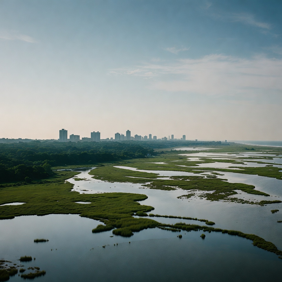 Aerial view of the Chicago skyline with tall buildings silhouetted against a clear blue sky. Lush green marshes and waterways stretch in the foreground toward Lake Michigan. The scene captures urban architecture contrasting with natural wetlands under hazy atmospheric conditions.