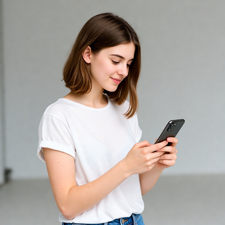 A young woman with shoulder-length brown hair stands in front of a plain gray background, smiling slightly while looking at her black smartphone. She wears a white short-sleeved t-shirt and blue jeans, holding the phone with both hands. Her expression appears engaged as she interacts with the device.