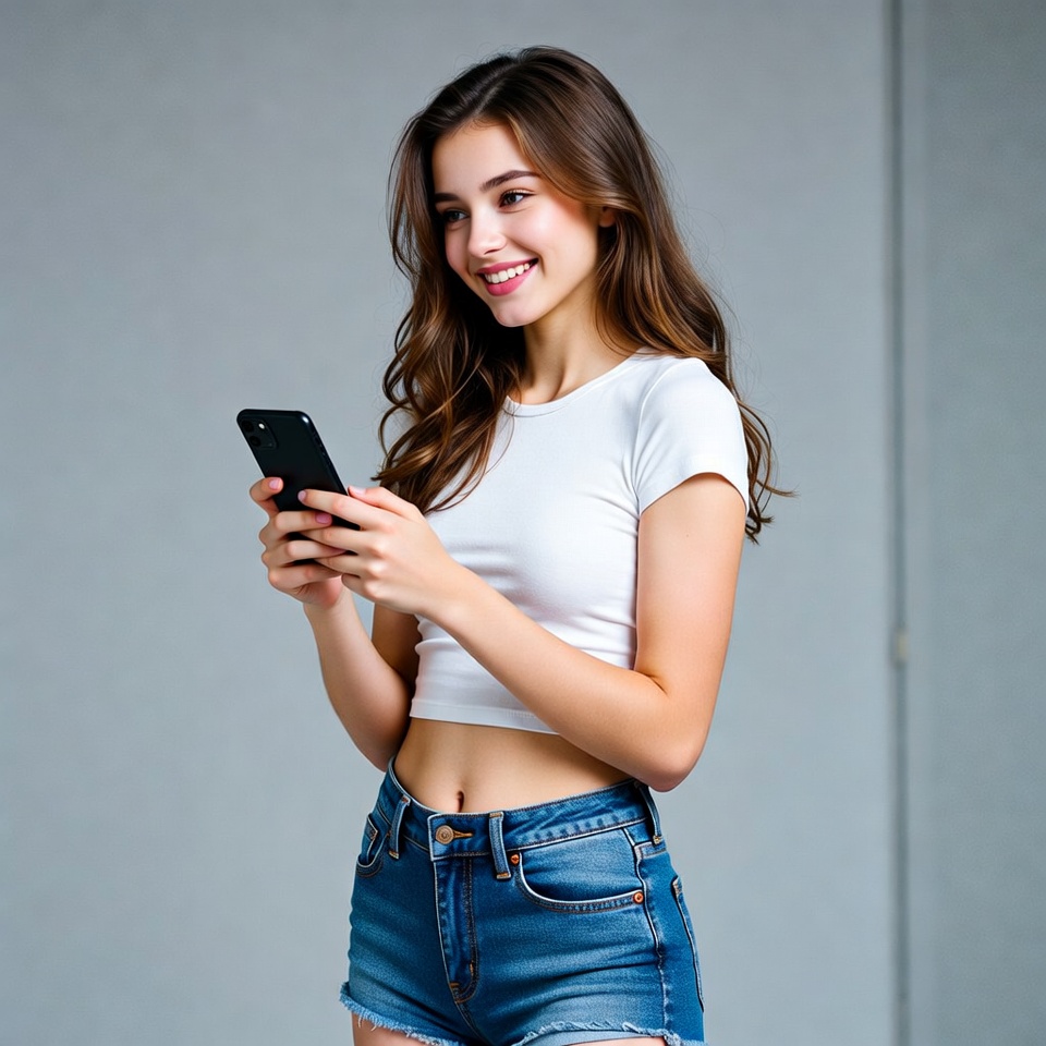 A young woman with long wavy brown hair smiles while holding and looking at her black smartphone. She wears a white cropped t-shirt and blue denim shorts, standing against a plain gray background. Her hands grip the phone in front of her midriff.