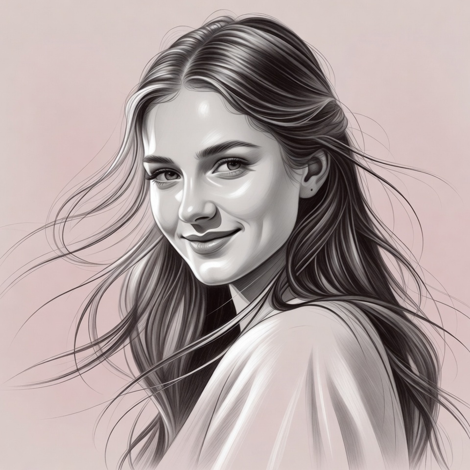 A digital illustration of a young woman with long brown hair flowing in the wind. She has a gentle smile, fair skin, and wears a light off-shoulder top. The portrait is rendered in a realistic pencil sketch style against a soft pink background.