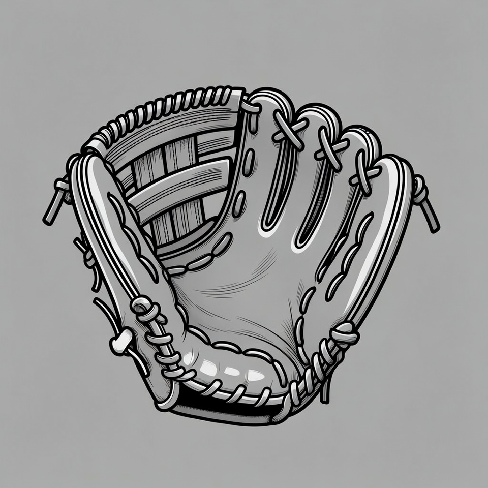 baseball mitt, catchers mitt, clipart, glove, grayscale, illustration, isolated background, laces, leather glove, sketch, sports equipment, stitching, webbing, baseball glove